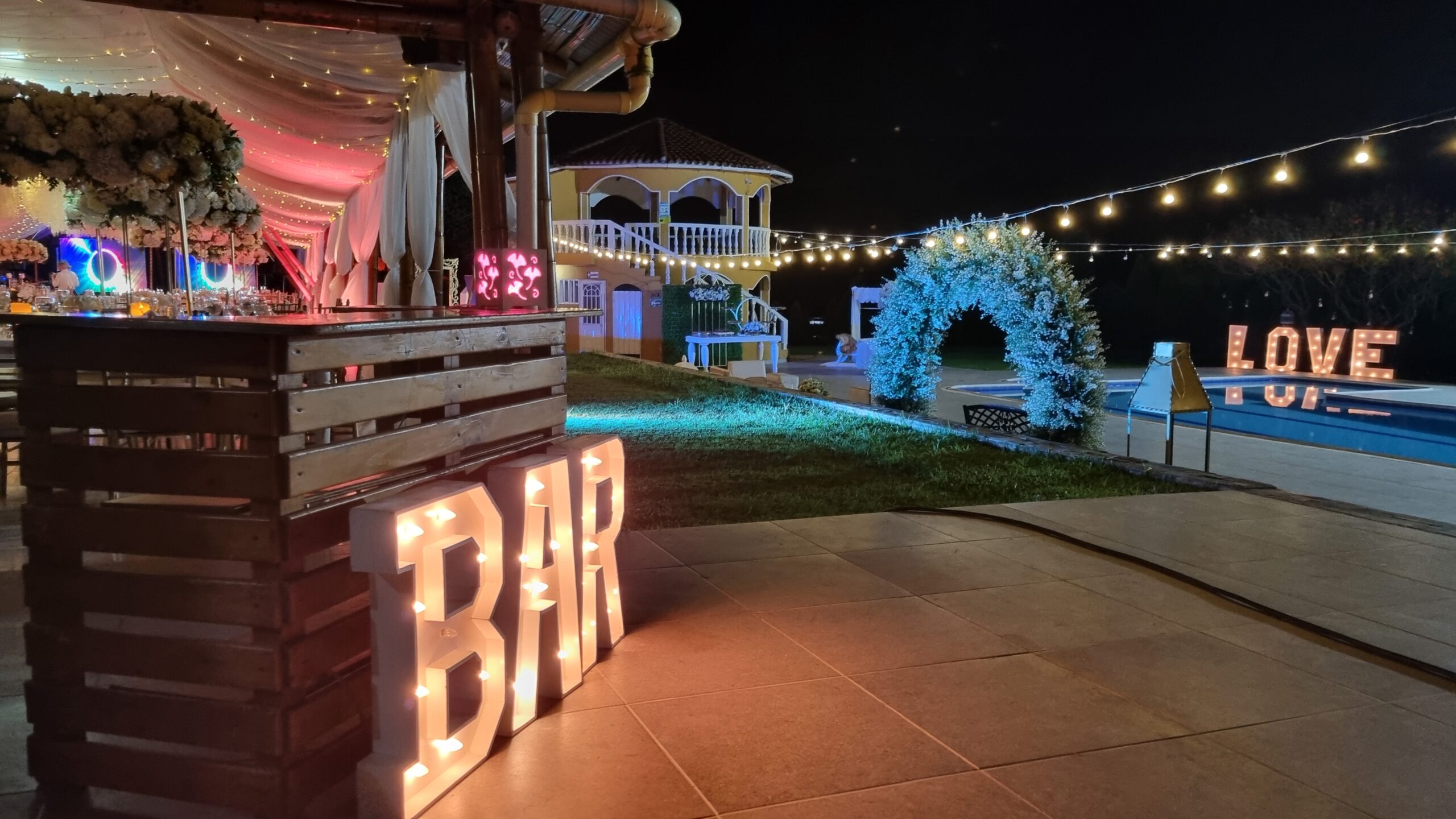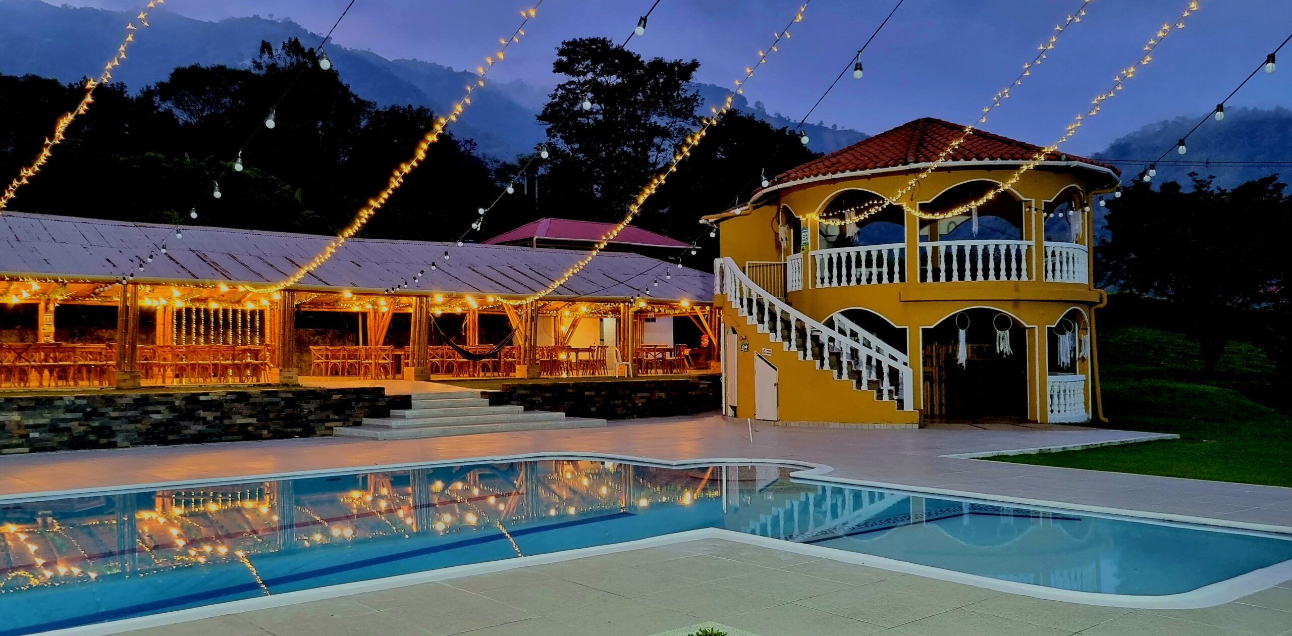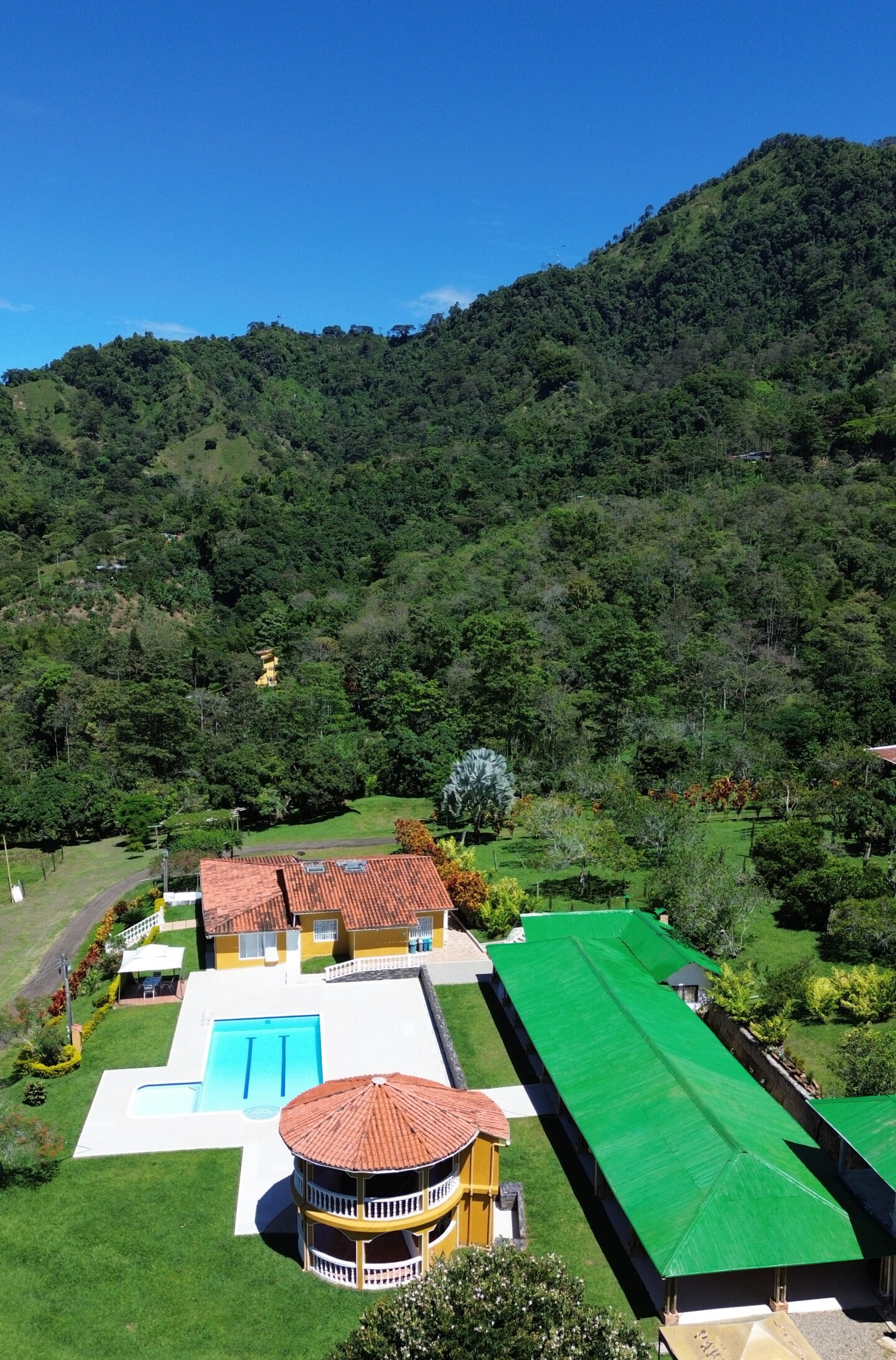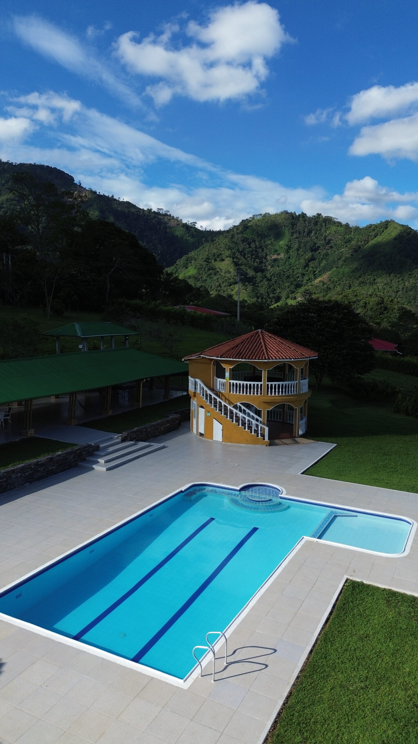La casa cuenta con 10 habitaciones, 8 baños, piscina, kiosko para eventos, mirador y piscina